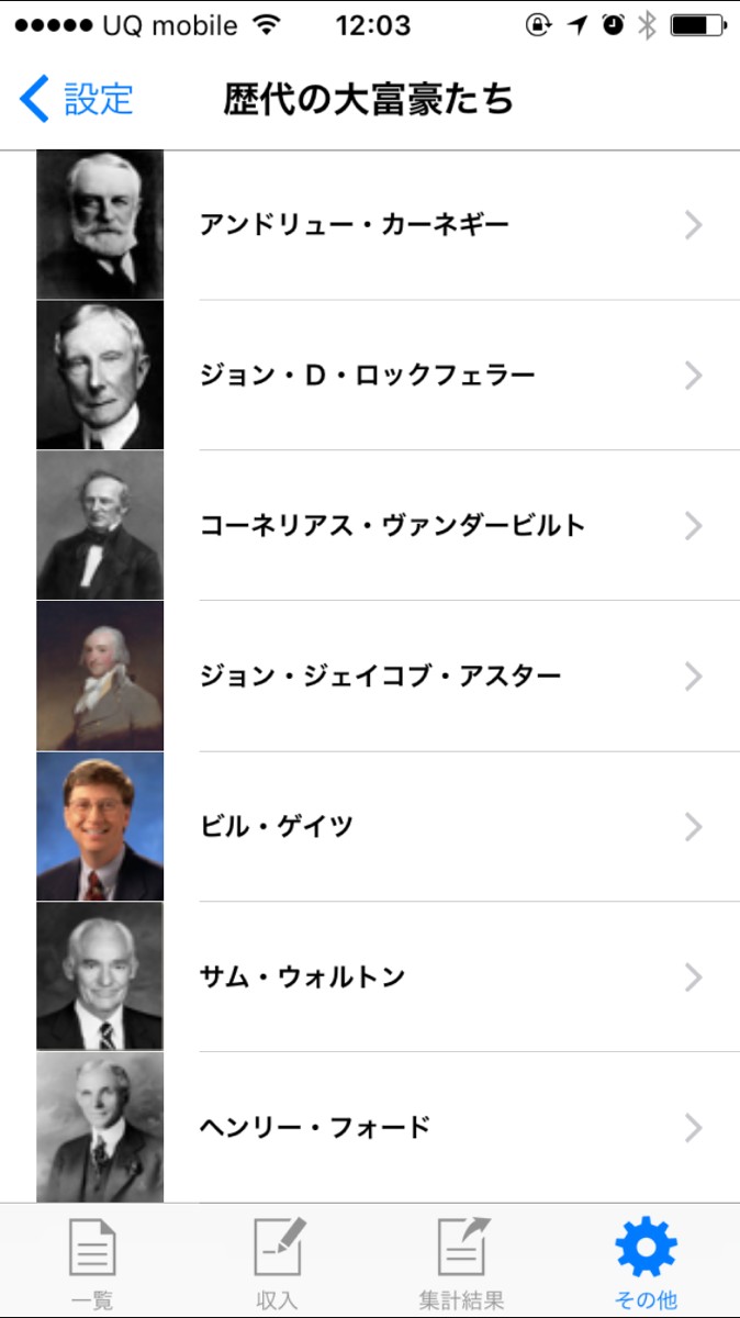 パスワードロック設定や、URLスキーム機能、収入一括削除などの設定が可能です。また、豆知識として「歴代の大富豪たち」「大富豪の考え方」といった読み物もあり、モチベーションを上げるのに役立ちます。
