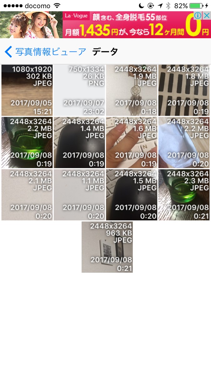 カメラロールの写真を一覧表示させると、写真にデータサイズ・容量・データ形式・撮影日時が書きこまれて一緒に表示されます。携帯内では写真の容量などは確認できないですが、このアプリがあれば簡単に調べられます。