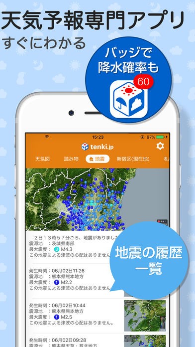 こちら、これだけの機能がついてなんと「無料」というアプリ「tenki.jp」は多くの人達が評価コメントをよせています。天気予報の詳細な対応はもちろん、その他、地震や突発的な集中豪雨などに不安を感じる最近の時勢に対応しまして「地震、豪雨」の速報、お知らせといざという時には頼りになるアプリです。そして、気温、気象との相性という流れで様々な季節のレジャーへの情報をご提供。さらに例えば花粉状況のお知らせ、秋の紅葉の季節等は行楽日和に最適なタイミングで計画するのにいつがベストのタイミングなど計画したりと広く予報以外のトピックを気象にからめて話題にしておりますのでお出かけの日程の決定にお役立ていただけると思います。「tenki.jp」を早速ダウンロードしてご利用ください。
