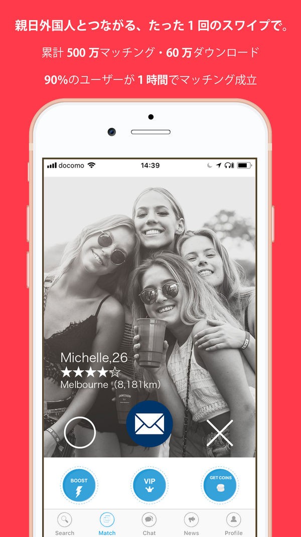25ヵ国でサービス展開されているマッチングアプリです。アメリカではネットで知り合って結婚・婚約したカップルのうち、1/3が「Match.com」のユーザーだったというデータもあるほど、普及しています。登録するには、クレジットカードでの年齢確認と、運転免許証などの各種証明書での本人確認が必須となっていて、相手の身元を心配する必要はほぼないと言えます。日本在住の外国人も数多く登録していて、検索画面で「人種」を指定することで、外国人を選ぶことができます。パソコン版では「言語」で検索もできるので、さらに絞り込みも可能です。