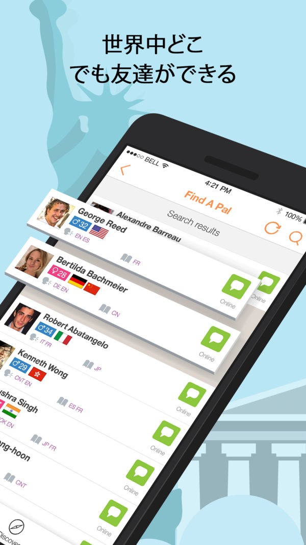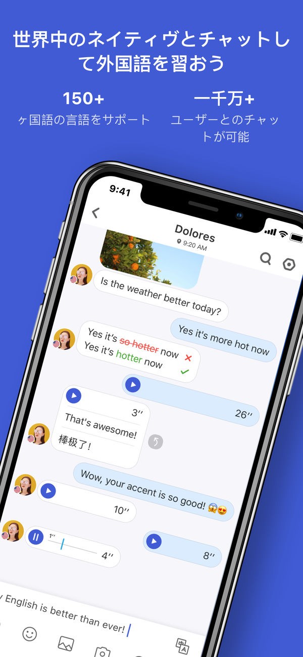 世界50万人以上の人とチャットをしながら語学が学べるアプリです。英語や日本語をはじめ16か国語で登録することができます。音声データを投稿できるので、ネイティブスピーカーからその場で発音をチェックしてもらえるのが特徴。チャットには自動翻訳機能もついているので、語学力に自信がなくてもしっかりとサポートしてもらえます。