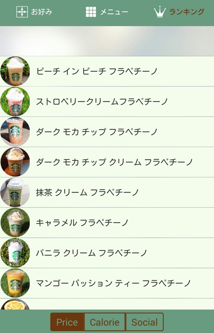 「メニュー」の項目をタップすれば、スタバのメニューが写真付きでズラリと表示されます。