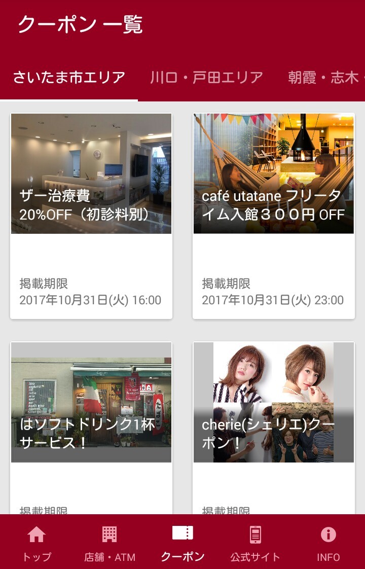 「武蔵野銀行アプリ」では、埼玉県に拠点を置く地方銀行らしく県内のさまざまなお店で使えるクーポンを手にすることができます。