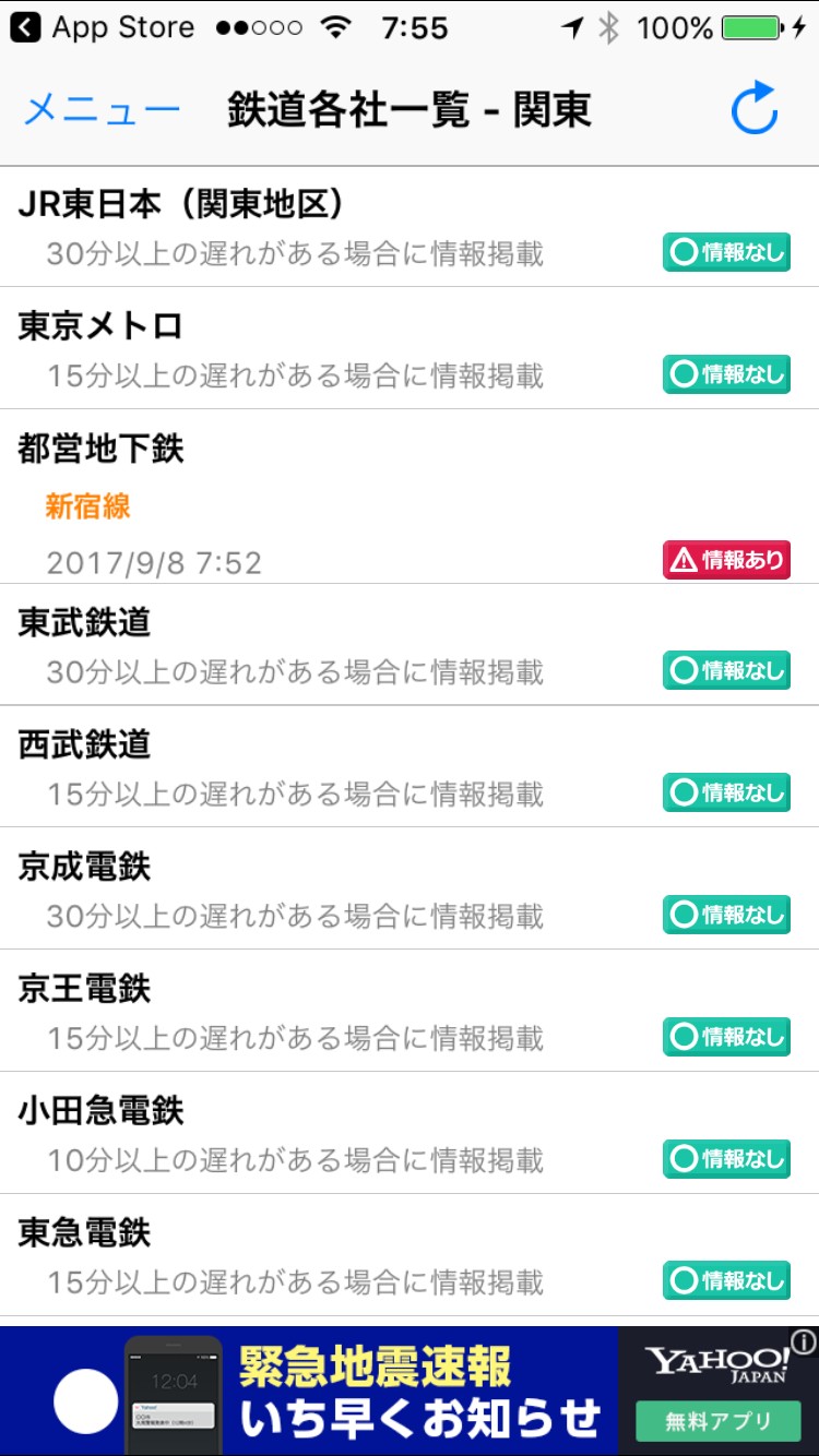 電車遅延情報では、路線ごとに通常運行、遅延あり、運休のお知らせが一目で分かるようになっています。