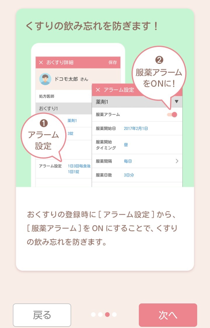 服用時点ごとに飲んだ/飲んでいないをチェックすることができ、更にアラームを設定することで、より確実に飲み忘れを防止することができます。