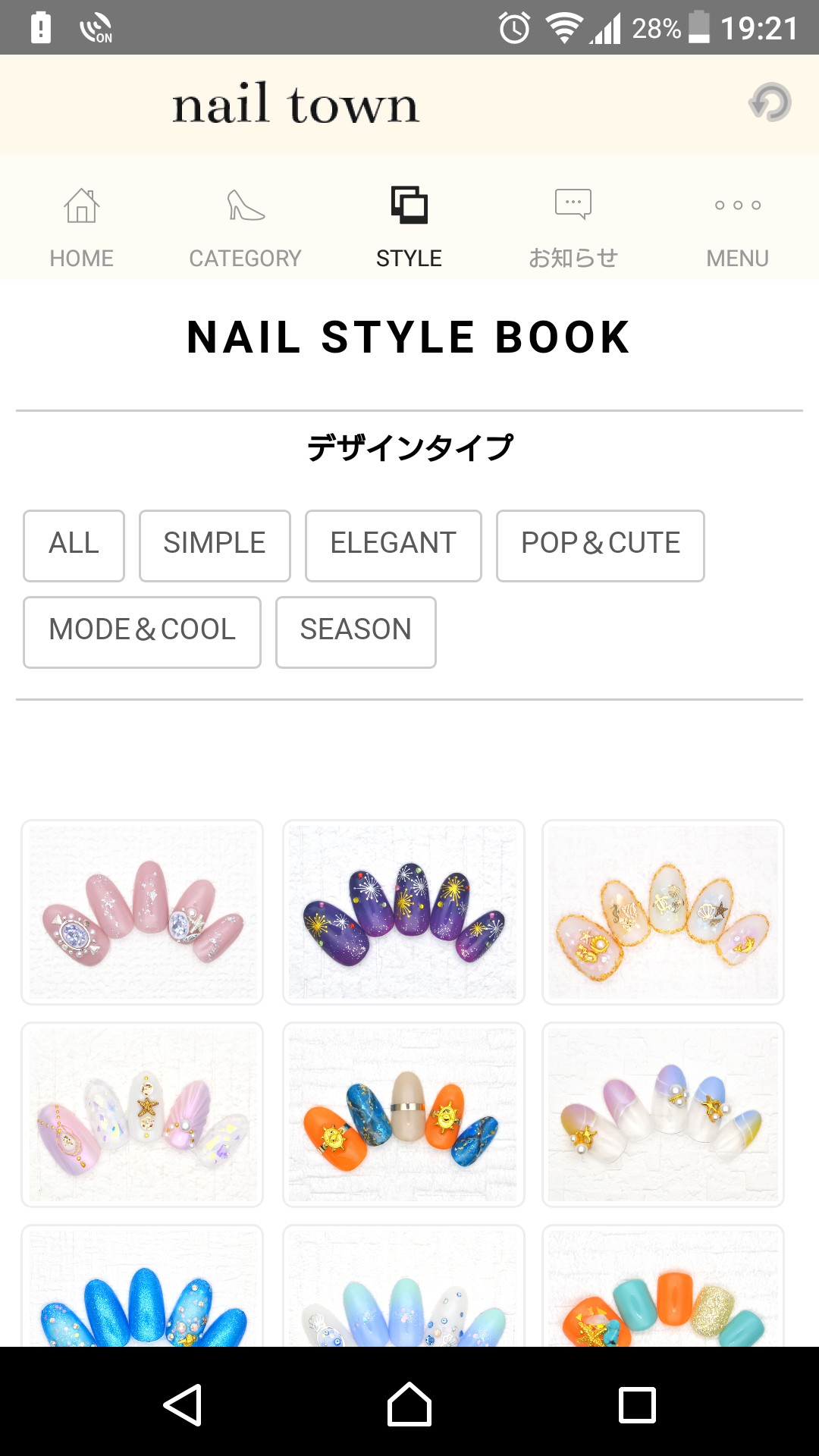 トップページの「NAIL STYLE BOOK」、または画面上のメニューから「STYLE」をタップすることで、最新のネイルスタイルのカタログを見ることができます。豊富なデザインが掲載されていて迷ってしまいそうですが、「デザインタイプ」から「ALL」ですべて表示のほか、「SIMPLE」「ELEGANT」「POP&CUTE」「MODE&COOL」「SEASON」の5種類のイメージで絞り込むことができます。まずはじっくり眺めてみて、気になるスタイルが見つかったらタップしてみましょう。