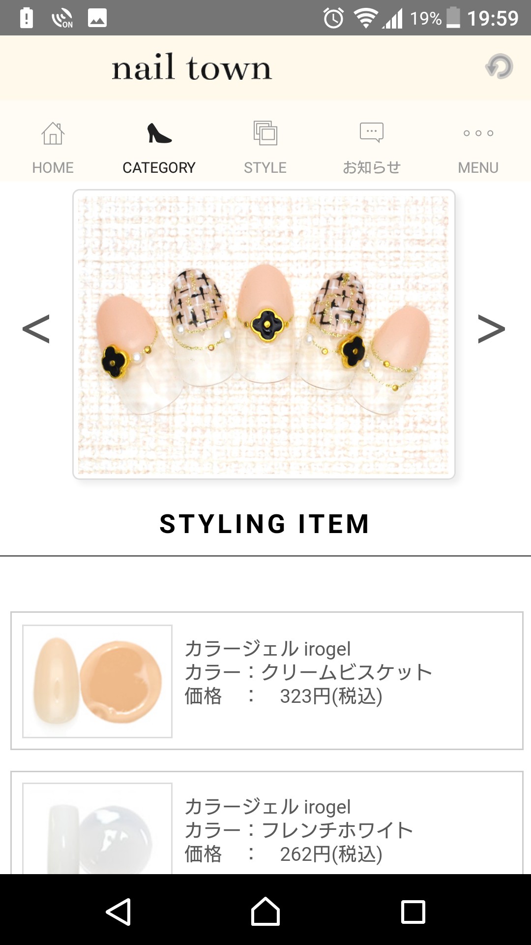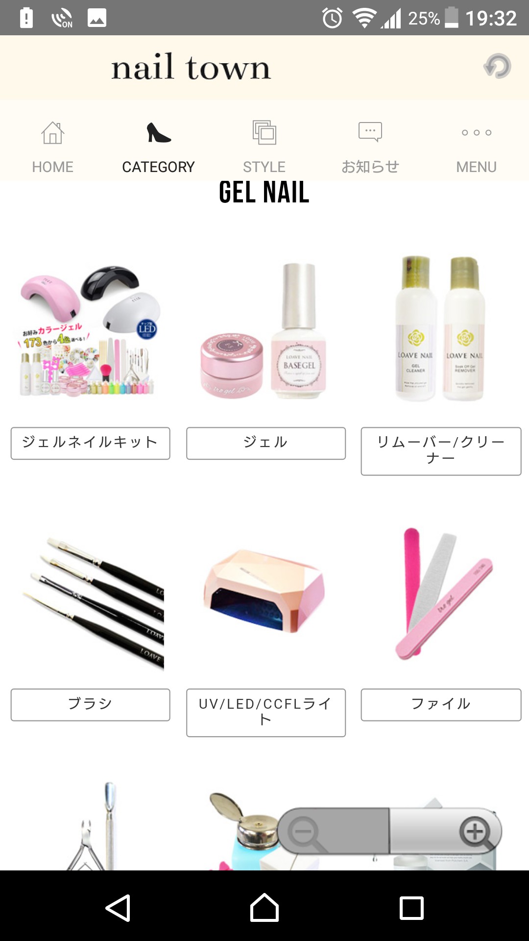 ネイルは自分でデザインする、またはやりたいネイルがもう決まっているという方は、トップ画面の「CATEGORY」から、オンラインショップのページを表示することができます。ジェルネイルで必要なUV照射器やジェル、ブラシやネイルファイル(爪やすり)などの基本的なアイテムやネイルケアアイテムだけではなく、ネイルアートに必要なクロムパウダーやメタルパーツ、ネイルシール、ラインストーンなども販売されています。