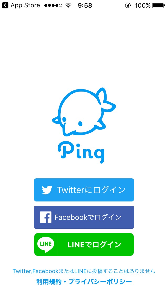 アプリを起動するとログイン画面が表示されます。Twitter・LINE・Facebookのいずれかのアカウントでログインをしてください。