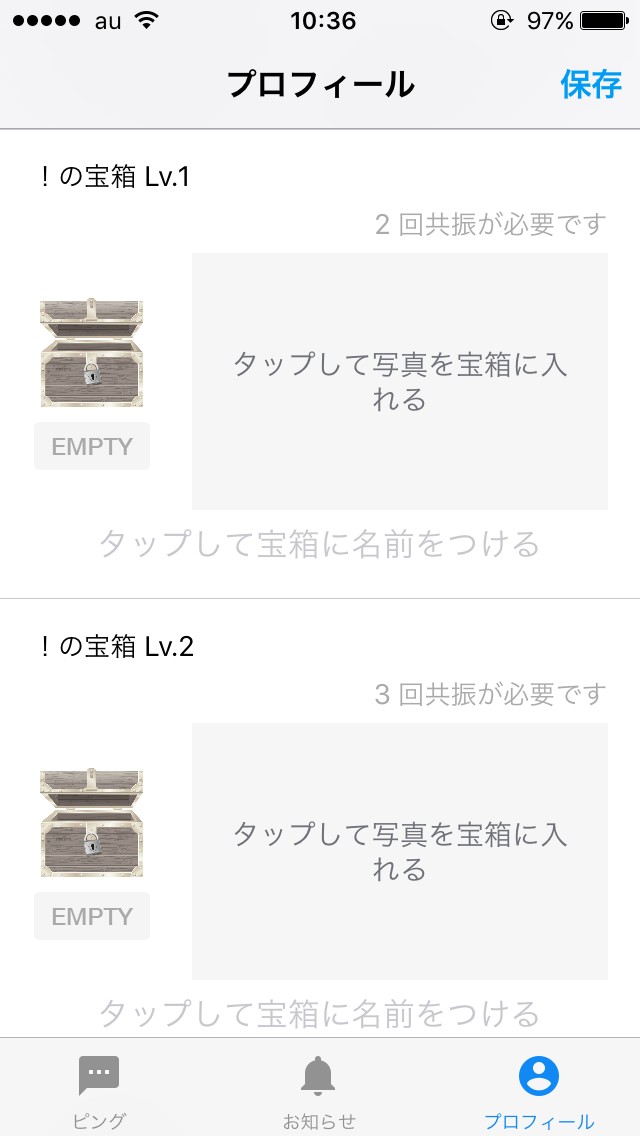 プロフィールではアイコン写真の変更や性別や誕生年などの基本情報の変更が可能です。宝箱に写真を入れることができ、2回、3回、5回、8回と共振した人にそれぞれ回数に応じた宝箱が開示されるシステムがあります。何度も共振して気の合う人にしか見せない特別な写真を最後の宝箱に入れておくなど使い方はあなた次第です。