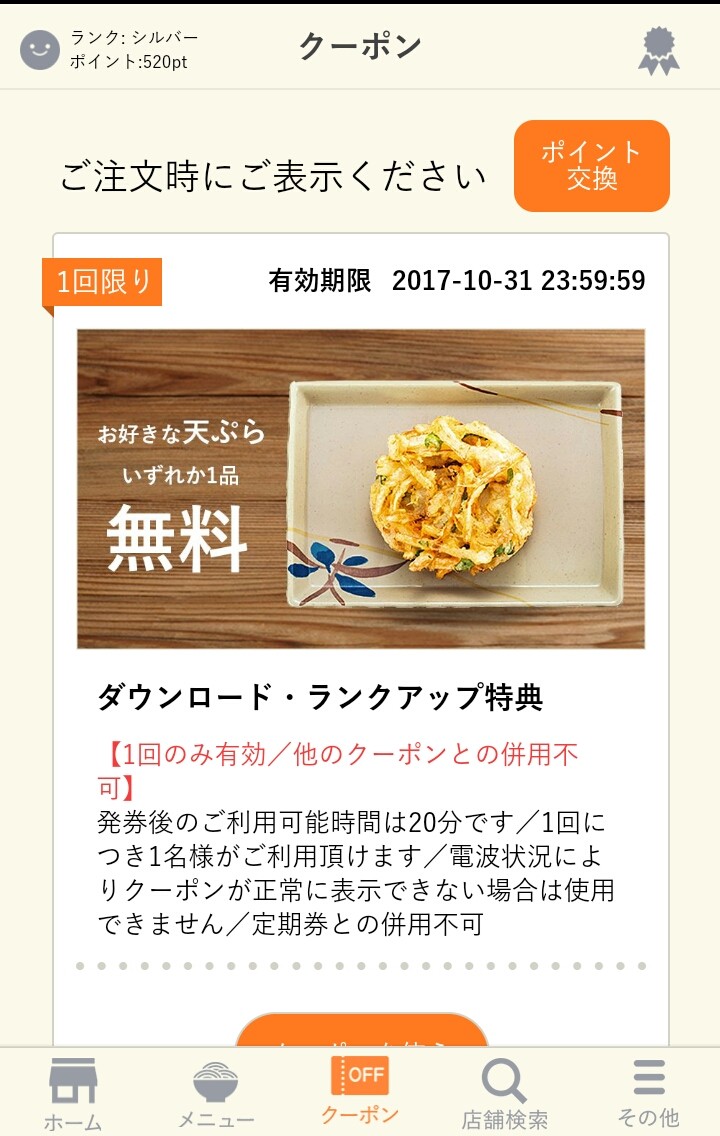 ポイントで変換できるクーポンは「天ぷら20円引き」といったものなどですが、少しでもお得にはなまるうどんを楽しめるのでうれしいですね。
