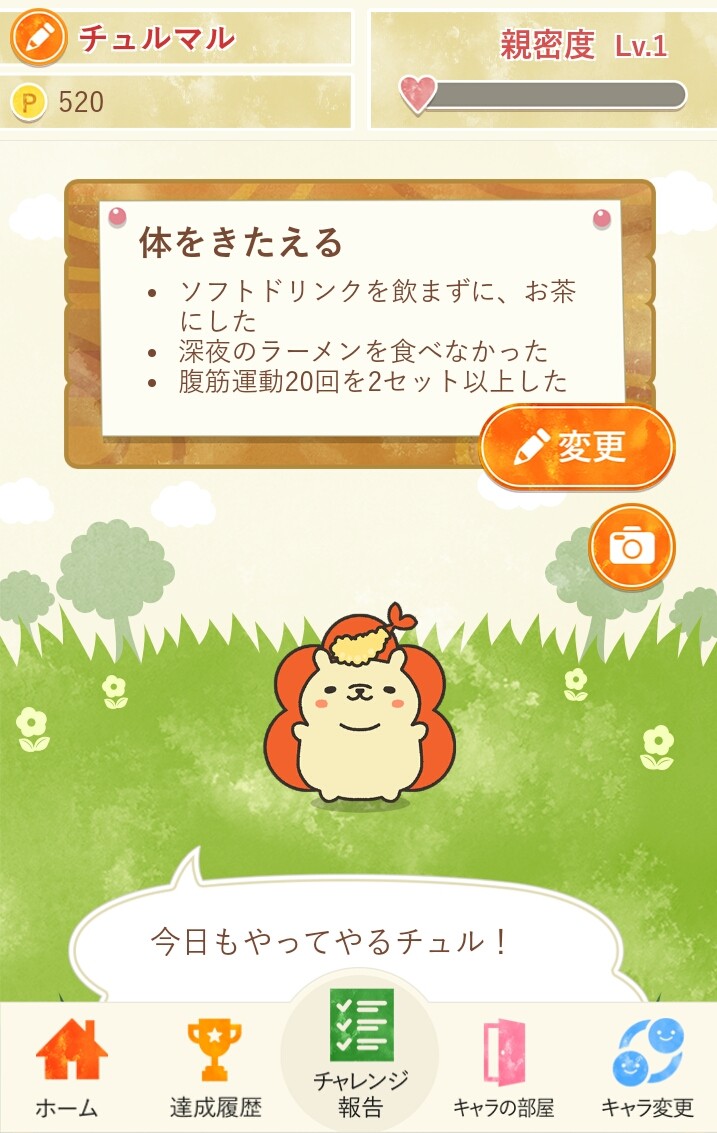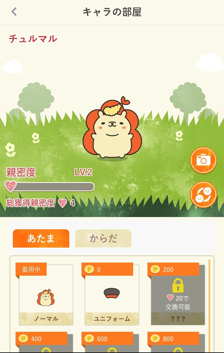 また、チャレンジ報告をたくさん行ってキャラと仲良くなると、キャラの着せ替えもできるようになります。
