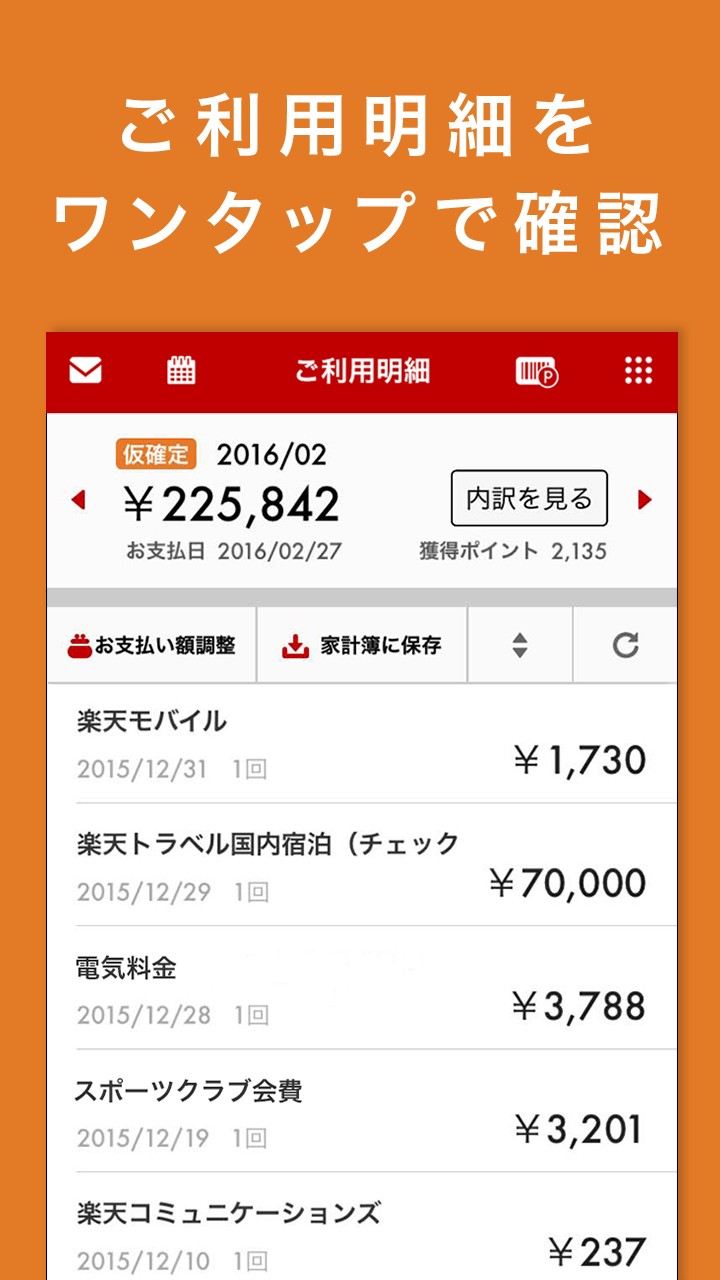 楽天カードにはダウンロード無料の「楽天カードアプリ」があり、マルチデバイス対応でスマートフォンやタブレットからアクセスが可能です。指紋認証ログインに対応しており安心、安全にログインできます。一度アプリにログインして指紋認証機能を設定しておけば、次回からは「1.アプリを起動」「2.指紋認証ログイン」の2ステップでアクセスできます。明細の確認やアプリ機能である家計簿を使って支出の管理がしやすいです。レシートをカメラで撮影して読み込めば、わざわざ手入力することなく家計簿に反映されます。