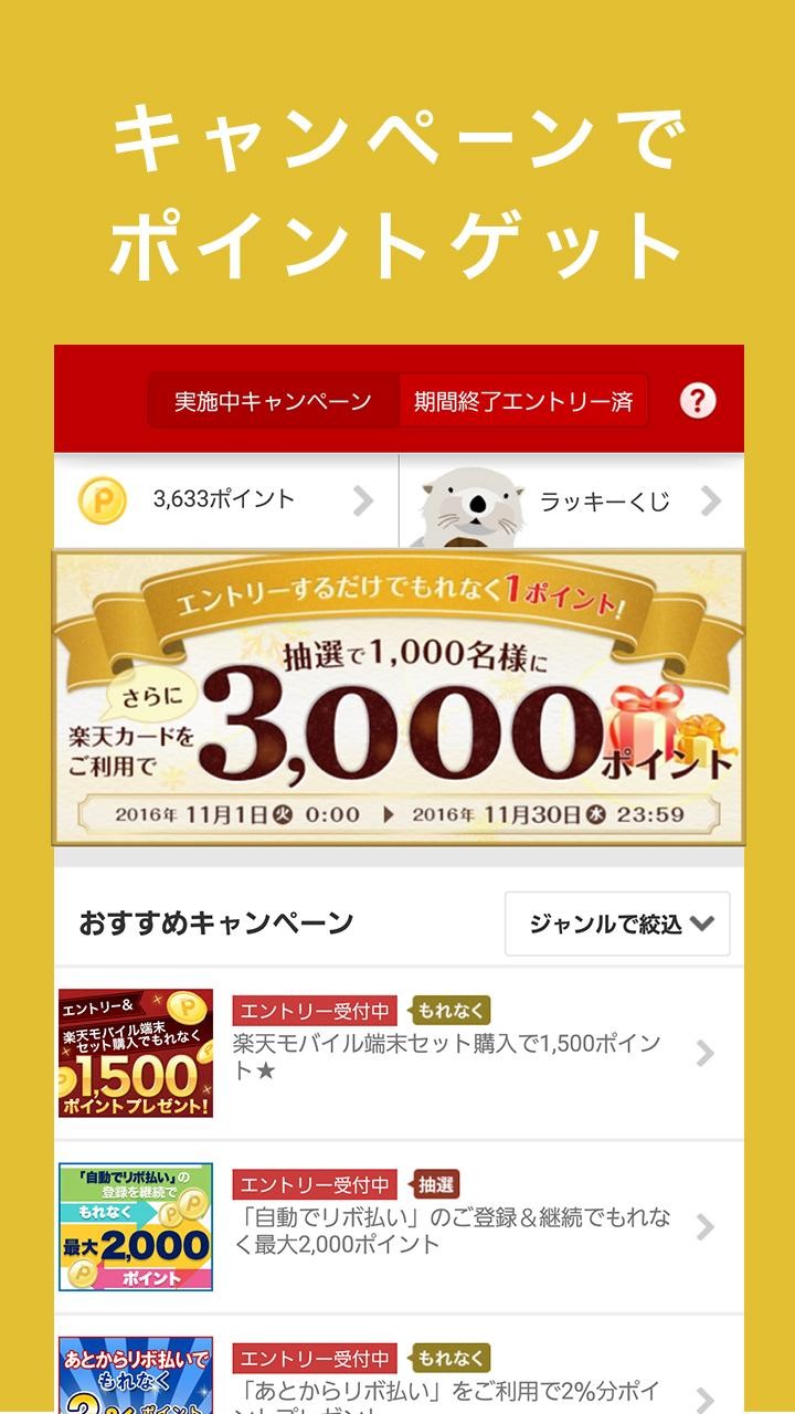 キャンペーンやラッキーくじを見逃すことなく楽しめたり、楽天カードが使えるお店が調べられたり、楽天の各サービスへアプリから簡単にアクセスできます。