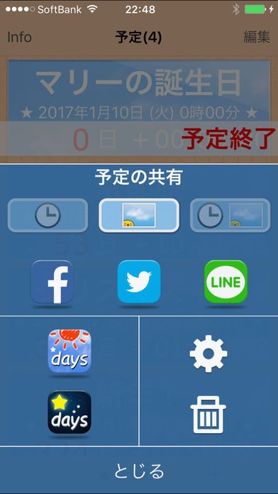 控えている予定をLINEやTwitter、Facebookといった主なSNSに投稿できるため、知人に知ってほしいときにこのアプリを使っていれば簡単にシェアすることができます。みなさんもこのアプリを使って大切なイベントに至るまでの日々も一秒一秒大事に過ごしませんか。