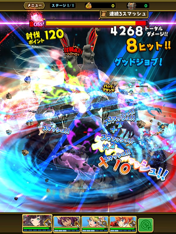キャラクターが攻撃して敵モンスターを吹っ飛ばすと、その先に居た仲間キャラがスマッシュを決めてくれます!