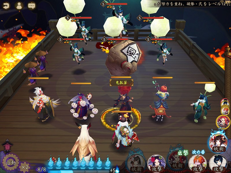 5対5で繰り広げる式神戦は、戦略と式神の育成度が物を言う場なんです!