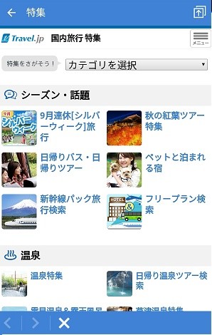 特集と週刊トラベルjpと項目ボタンが2つあります。特集では国内旅行のシーズン・話題、温泉、テーマ【フリープラン・ビジネス、スポーツ、グルメ、世界遺産、学生向け、宿の特徴、一人旅・ペット旅行、パワースポット】、乗り物・交通手段、エリア【日本の各地方】、イベント【各季節】、その他と項目が分かれていて、その季節ごとの旬な物を取り上げてツアーを紹介してくれています。週刊トラベルjpでは国内だけでなく海外までのツアー情報を週刊ごとにまとめて情報を教えてくれます。読むだけで、その内行きたいなとか、今度はここに行こうとか旅行好きでなくても旅行が好きになるでしょう。