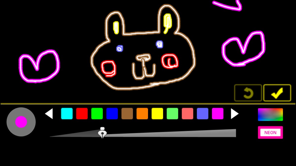 手書き機能では豊富なカラーの中から筆の太さを選んで描くことが可能。描いた絵は、ネオンのように輝きます。