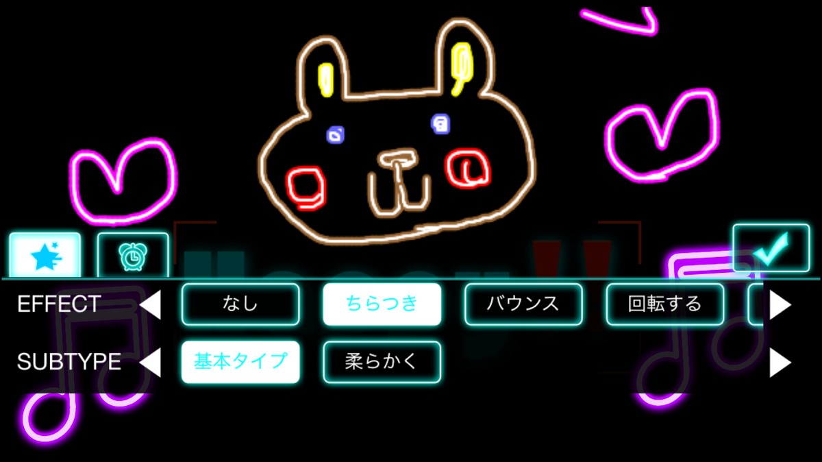 アニメーションのエフェクトが、ちらつき/バウンス/回転する/虹効果の4種類用意されており、それぞれに動き方のサブタイプが選択できます。細やかなアニメーションの選択ができるので、自分好みの動きかたに設定できそうです。