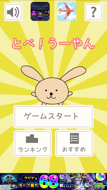 「とべ!うーやん」とは、ウサギのように長い耳が二つあり、見た目は丸々とした謎の生物が登場します。その謎の生物の名前はうーやん。うーやんは崖を登るのが好きな変わった生物です。なんでも、崖を見ると登らずにはいられない性格なんだとか。でもいつも、「てきやん」と言って崖の途中では敵がカミナリを落としてきて、邪魔してくるんだ。うーやんがより高く登れるように手伝ってあげてくれないかな?ということで、崖を登ることが好きなうーやんが、上へ上へと登っていけるようにお手伝いをするゲームアプリです。また、崖を登ることでスコアが加算され、どのくらい登ったのかスコアで競うことができます。ハイスコアを目指して崖を登ろう。