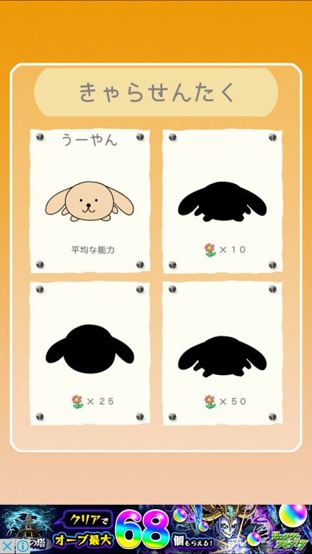 「とべ!うーやん」では、キャラ選択をすることができます。キャラは全部で4種類。崖を登る時に出てくるお花を集めることで新しいキャラが使えるようになります。お花は一度取ったら、そのまま次のゲームに数を引き継げるので、最初はお花を集めることを目標してもいいかもしれませんね。