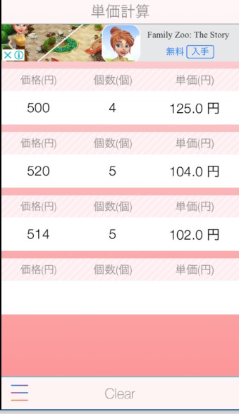 単価の計算ではアプリの単価計算をクリックし、 価格や個数を入力します。