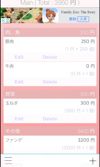カテゴリーごとの小計ではアプリのメインから右下の+ボタンをクリックし、商品名・カテゴリー・単価・個数をそれぞれ入力していきます。