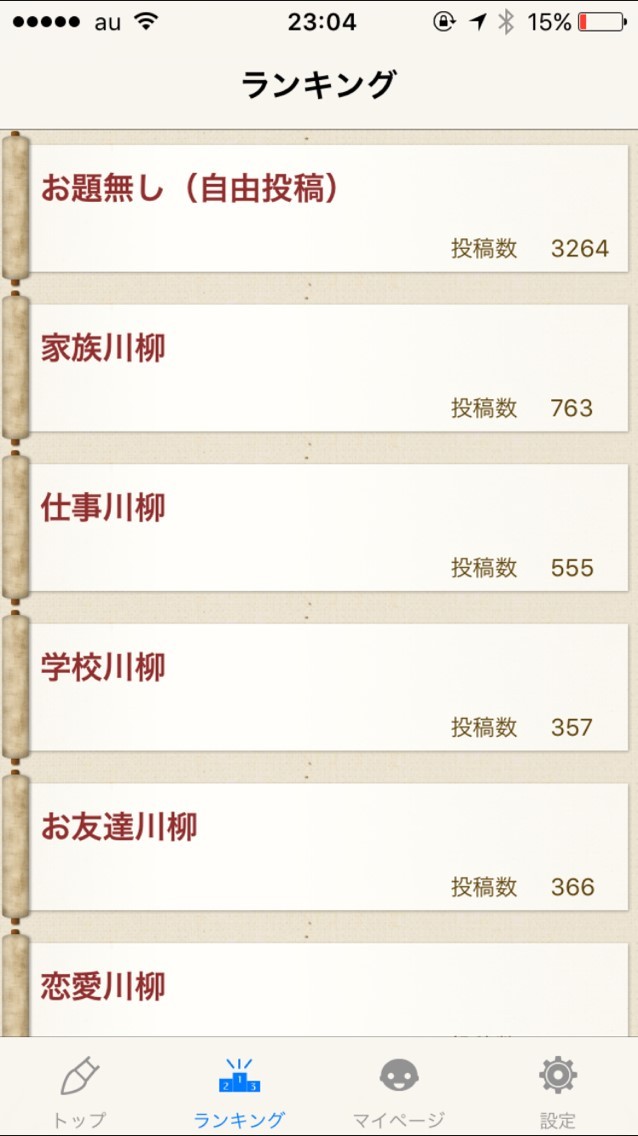 「みんなの川柳大賞」はアプリ内に投稿された作品を閲覧したり、自信作を投稿したりして川柳を楽しむことができるアプリです。投稿された作品は自由投稿をはじめ家族、仕事、学校、友達、恋愛などとお題に沿ってジャンル分けされており、好みの作品を探しやすくなっています。作品の中には海外からの投稿もあります。投稿者の年齢や地域が幅広く、様々な作品を楽しめることがこのアプリの大きな魅力です。自分の作った作品も手軽に投稿することができ、投票による評価を受けることもできます。