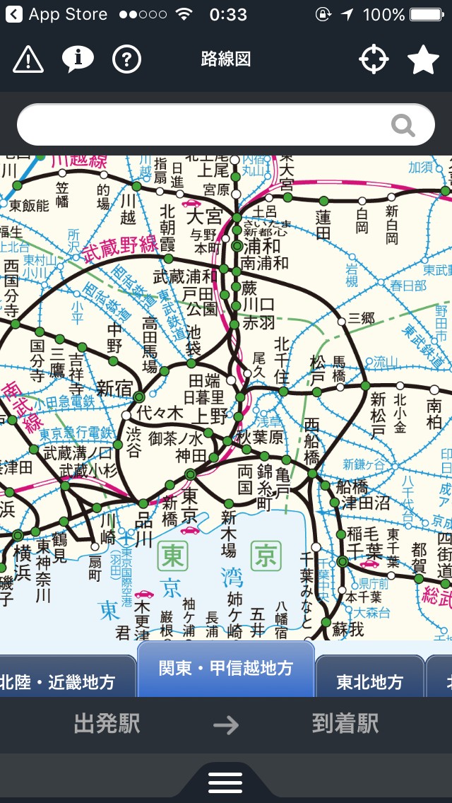 画面下部のタブにそれぞれ地方別の路線図が設定されていて、最も自分が利用する地方の地図からすぐに目的の路線を探すことができます。