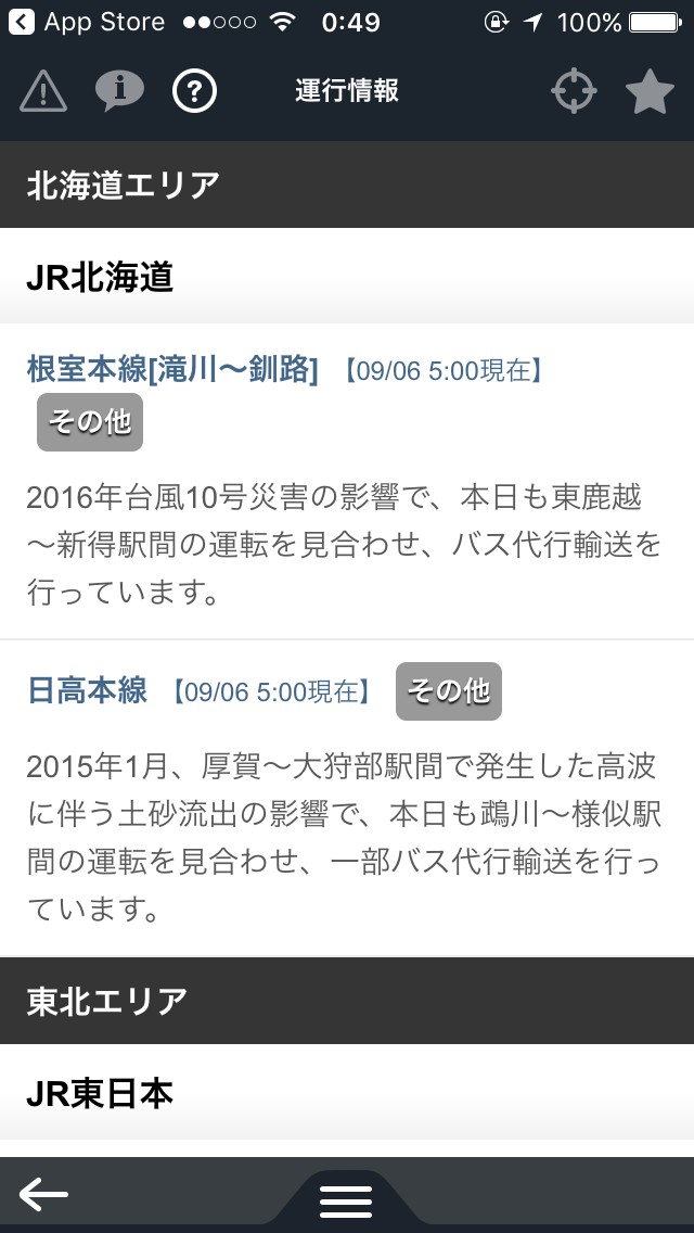 これらすべてが全国に対応しているため、都心の路線だけでなく地方での運行情報もしっかりと掲載されているのがこのアプリの便利なポイントです。