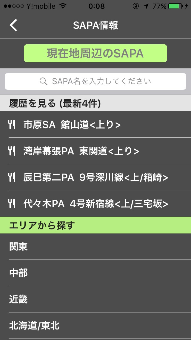 このアプリはそんなニーズにもしっかりと対応されていて、各所のサービス・パーキングエリアをタップすることでそのエリアの細かな情報を閲覧することができます。