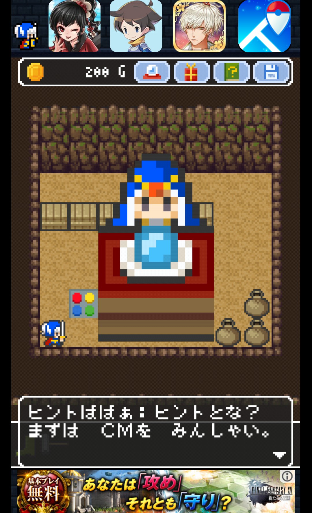 「ヒントばばぁ」からヒントを聞くにはCMを見なくてはいけません。勇者オススメのアプリが紹介されるので、興味があればダウンロードするのも良いでしょう。
