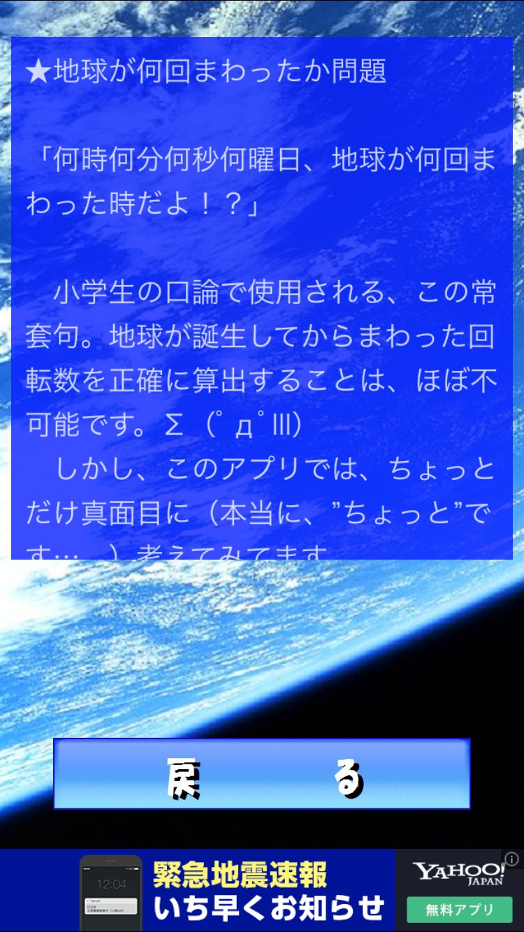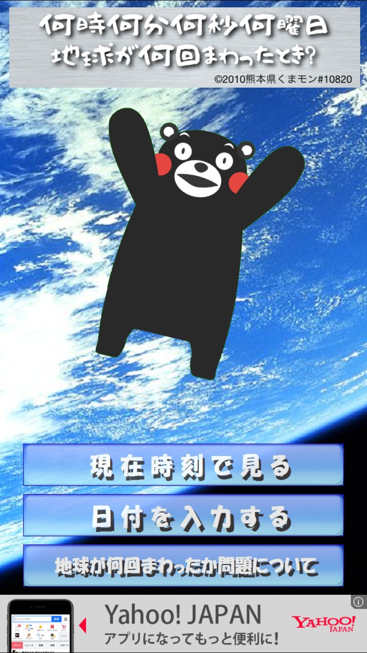 今が何時何分何秒何曜日、地球が何回まわった時かを表示してくれるアプリです。それだけ・・・?それだけです!!とても単純でシンプル過ぎるアプリですが、これさえあれば、質問されたときにあたふたすることはありません。