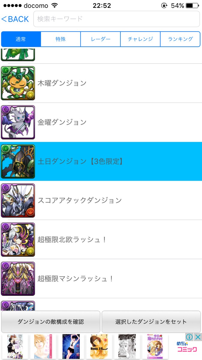 画面をスワイプすると、ダンジョンを選択するボタンがあります。ここをタップして希望のダンジョンを選択してください。その後、敵の名前を選択するボタンをタップして計算したい敵を確定します。