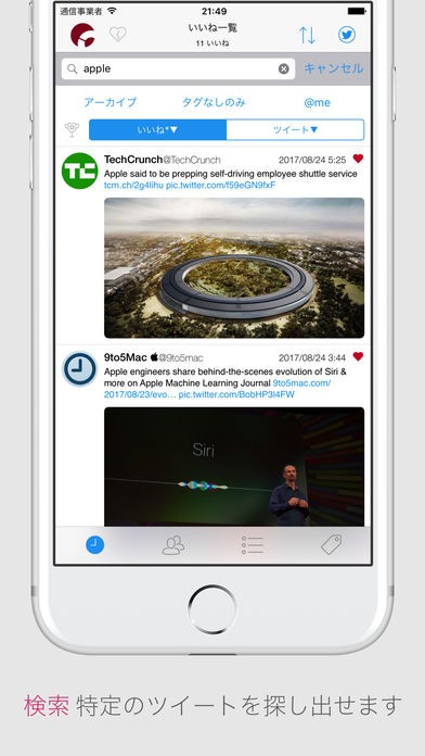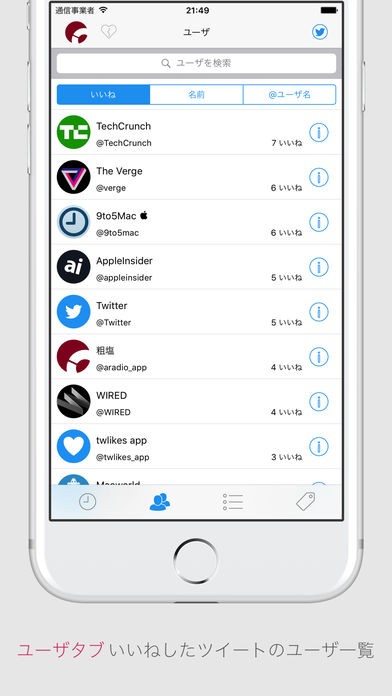 タイムライン掲載順やユーザー別と、リストごとに「いいね」したツイートを確認できる便利なアプリです。