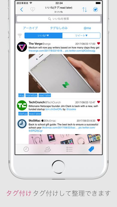 - 「いいね」したツイートにタグ付けをして、タグの対象別に表示が可能