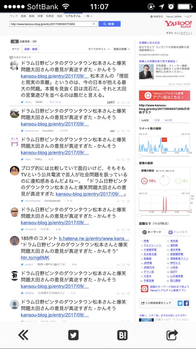 実際に「話題のニュースを厳選してお届け! - OrigamiNews」をインストールして使ってみました。このアプリは、Twitter・Facebookとのアカウントの連携は必要ないので、ダウンロードすればすぐに使い始められます。 表示されたニュースの中から気になるニュースをタップすると、画面がくしゃっと折り紙のように折りたたまれて記事が表示されます。記事を読んだ後、そのニュースに対する反応が見たくてコメント欄もチェックすることの多い私ですが、このアプリではコメントのチェックも簡単に行えます。画面下にある吹き出しマークをタップするだけでYahoo!リアルタイム検索を使ったSNSでのコメントをチェックすることができるのです。さらにそのページで「B!」のマークをタップすると、はてなブックマークでのコメントもチェックできます。ニュースと一緒に、みんなの反応もチェックできる機能はうれしいポイントです。