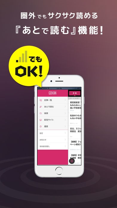「五感を刺激する2chまとめ-Gokan(ゴカン)」は2ちゃんねるをアプリにしたもので、ネットで見るときよりも快適に2ちゃんねるを楽しむことができるアプリです。快適に使えるポイントとして圏外であってもサクサクと読める“あとで読む”機能があります。面白そうな記事を“あとで読む”に登録しておけば、ネット環境がなくても2ちゃんねるを楽しむことができます。