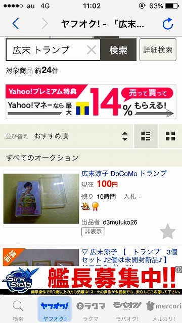 すると、現在、ヤフオクで出品されている広末のトランプが表示されます。