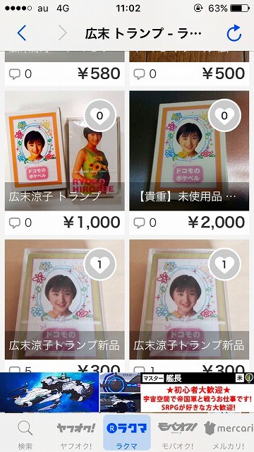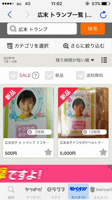 また、広末のDOCOMO限定のトランプはモバオクでは500~5,000円で取引されているのがわかります。