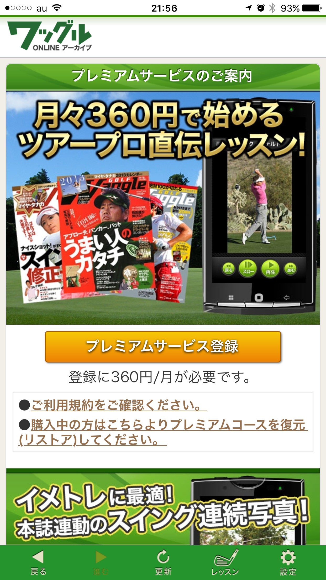 「ゴルフ専門誌「ワッグル」- ツアープロ直伝レッスンをお届け。」ではアプリをダウンロードした段階では記事を途中までしか読むことができません。プレミアムサービスに登録することで記事を最後まで読むことができます。