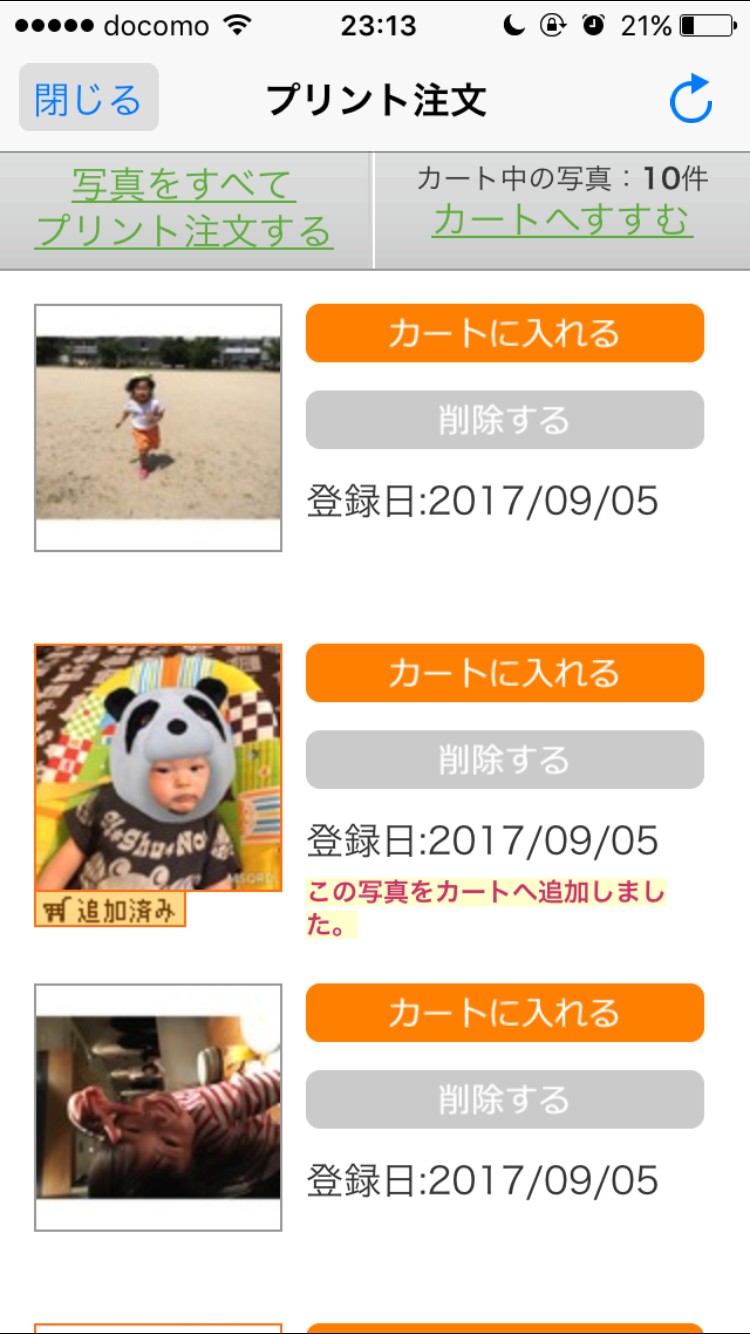操作方法はとても簡単。プリントしたい写真をアルバムから選択して、アップロードします。あとは欲しい写真を吟味して、カートボタンを押したあと、大きさや枚数を選択して終了。
