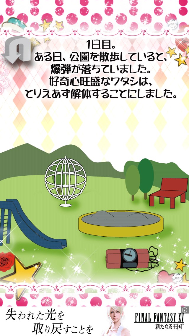 するとなんの脈絡もなく公園に爆弾が落ちていて好奇心が旺盛という理由から爆弾解体をする流れになり”公園からの脱出”という物語がスタートします。