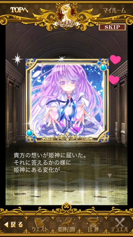 「ヒメキス」は、神話の神や歴史上の英雄などがモチーフになっていて、それらを美少女に書き上げたのが「ヒメキス」。なんと、その美少女の姫神とキスをして契約ができちゃうんです。姫神と共に、世界の王となるべく冒険を繰り広げる、恋愛シミュレーション感覚の無料で遊べる、萌える美少女育成ファンタジーカードバトルゲームです。 美しい姫神がレベルMAX状態での「デレ合神」を行うと、女神はアナタに恋をしカードイラストも変化します。美少女女神を育成してデレ合神をしよう。萌え系恋愛シミュレーションゲームの決定版としても大人気のアプリですよ。