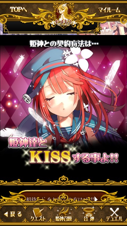 「ヒメキス」での最大の魅力はここにあった。姫神と契約を交わすにはキスをする必要がある。キスをして契約を交わすことだけあって、姫神のイラストも目を閉じている。まるで本当にキスをしているかのような気分を味わえるぞ。神話の神や歴史上の英雄の美少女達をキスして契約が交わされるなんて、なんだかちょっとだけいけないことをしているような気分にもなりますよね。このゲームは、人前でプレイするのは危険かもしれませんね。お家でこっそり楽しむのにおすすめのアプリです。君は何人の姫神と契約を交わすことができるのか?自分だけのお気に入りの姫神を見つけて擬似恋愛を楽しもう。
