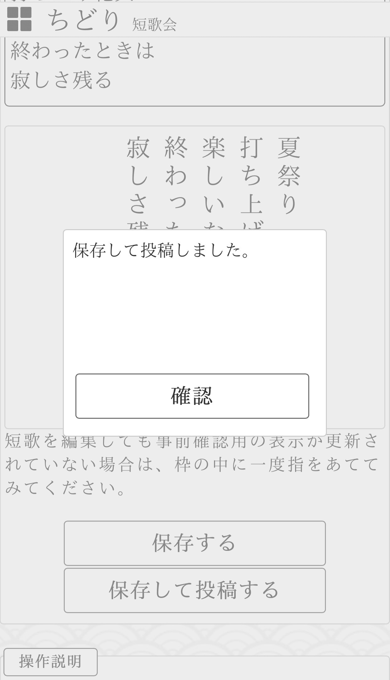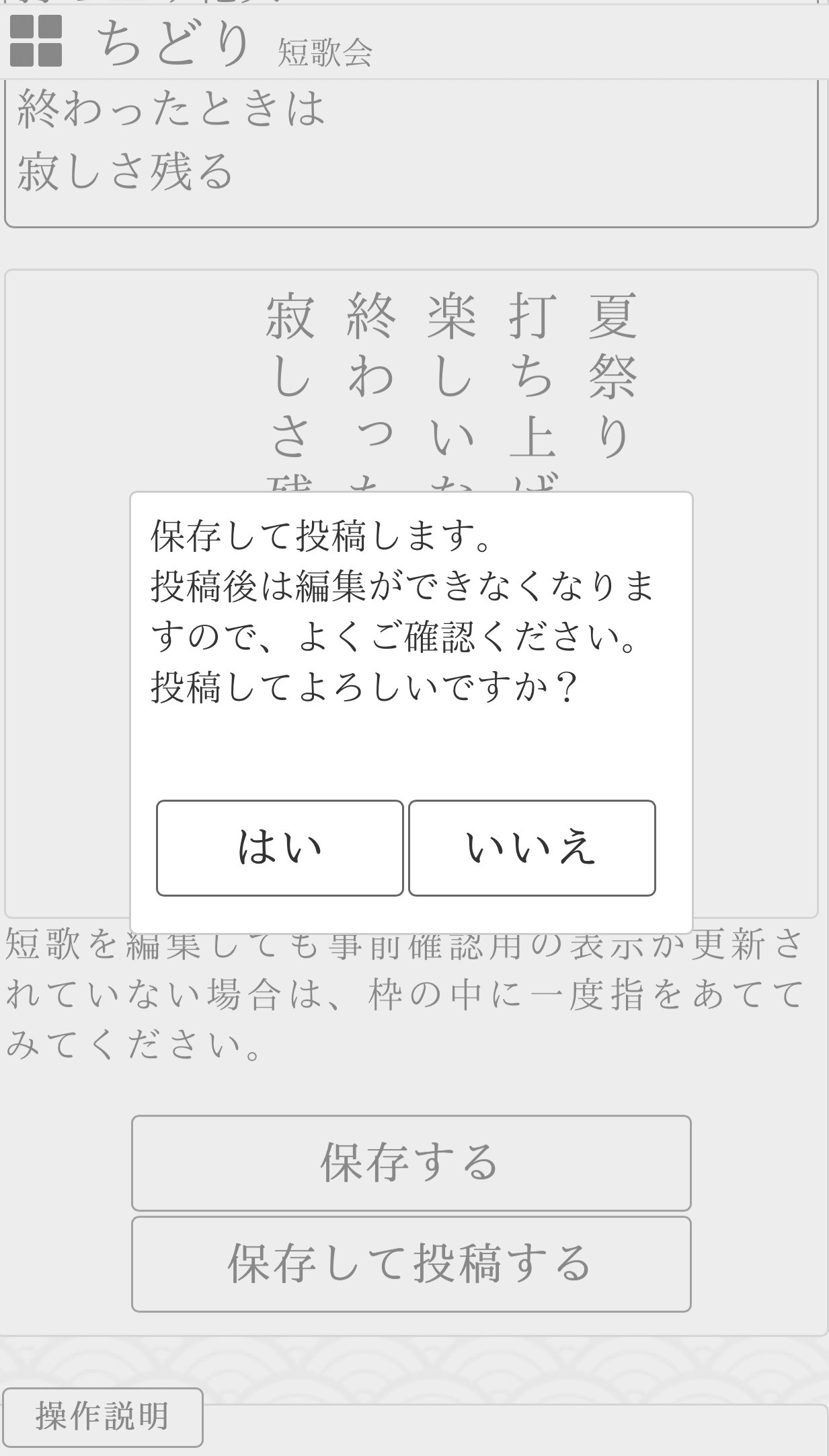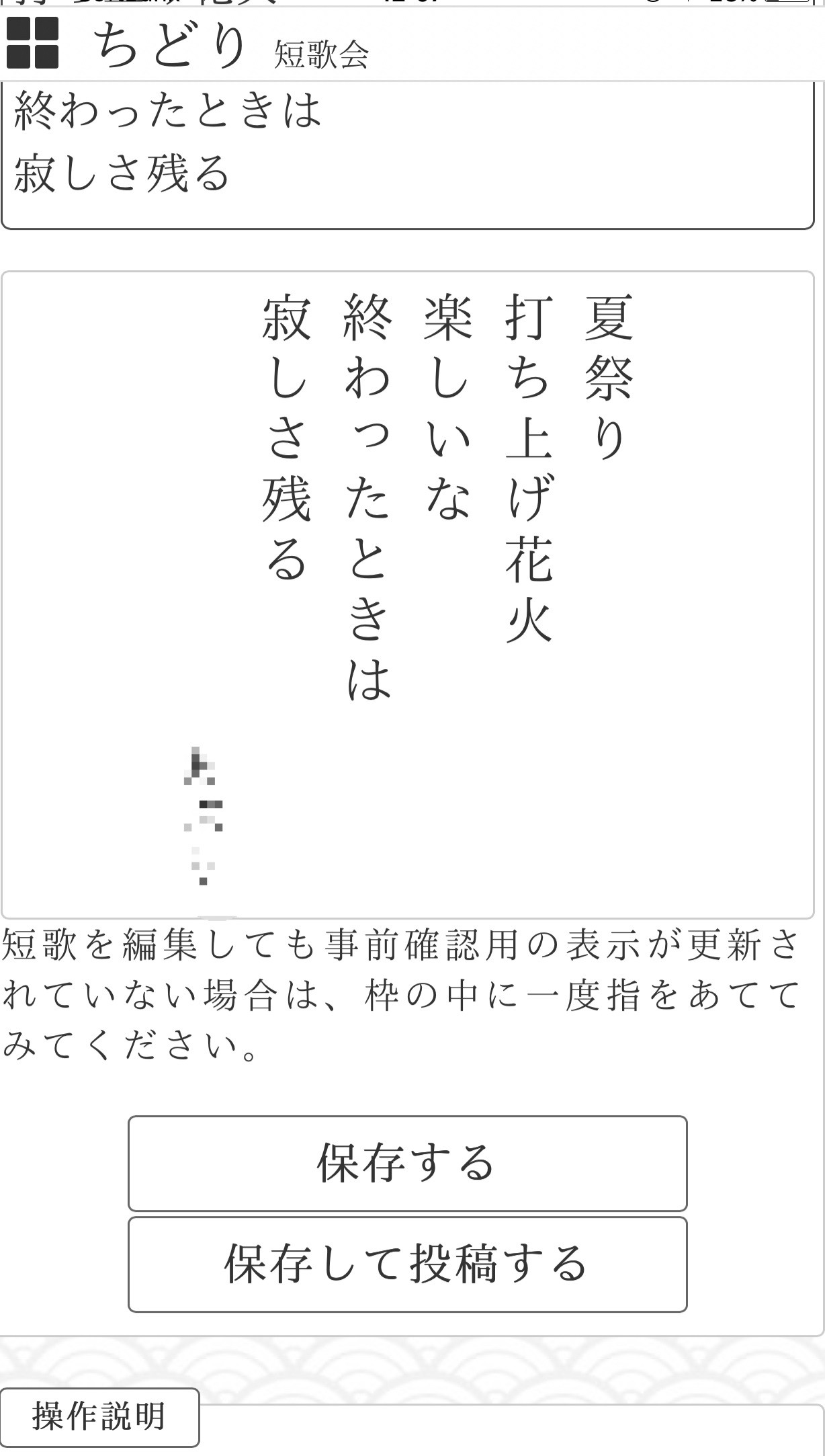 短歌の作成が終わったら、「保存する」か「保存して投稿する」を選びます。この時点でまだ短歌を修正したいようであれば、「保存する」。作った短歌を投稿したい場合は「保存して投稿する」をタップします。