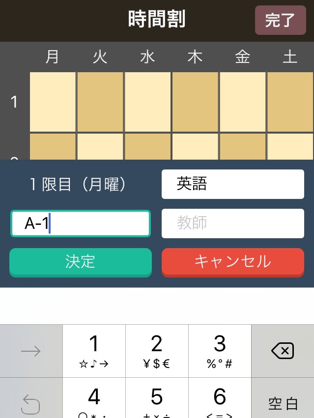 例えば、月曜日の1限目に英語の授業が入っている場合、項目をタップし各種(授業名など)入力後、設定ボタンを押せば、設定完了。