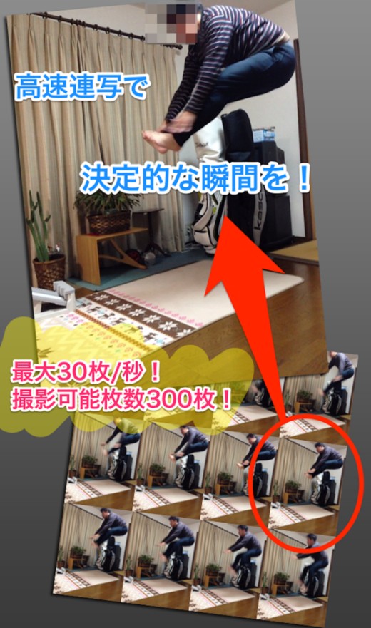 1秒間に30枚の写真を撮影できる連写カメラアプリです。シャッター音やフラッシュを消せるので、ペットや子供の自然体を撮影しておけるのが魅力です。連写画像はすべて保存されるため、多用しすぎるとデータ容量を圧迫することがあります。運動会やペット撮影で大変役立つので、使いどころを決めて活用するといいでしょう。