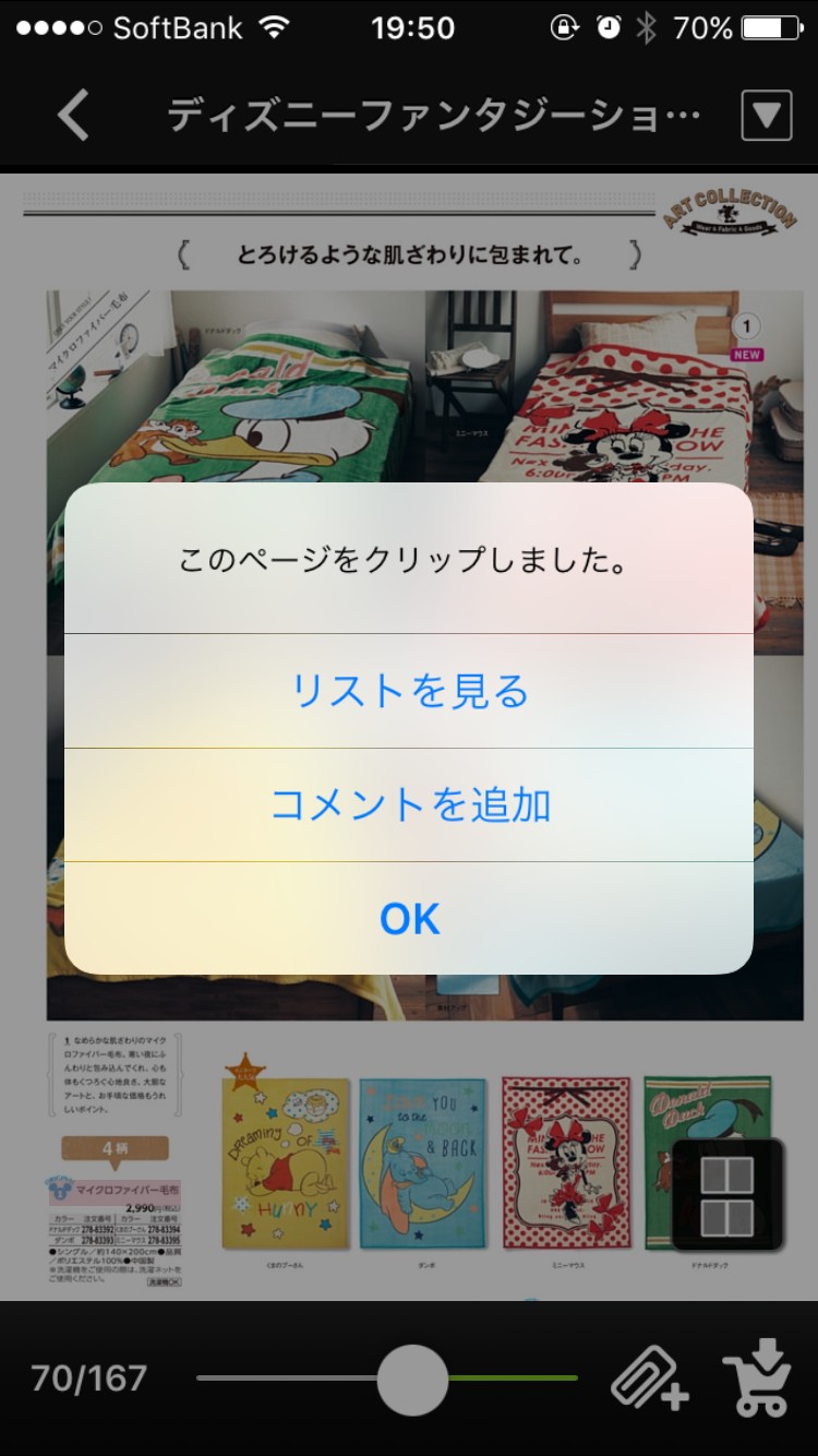 カタログを見ていて、気になる商品がある時って、後からでも見れるように、ページの端を折ったりしませんか?それと同じような機能がこのアプリにはあるんですよ!操作方法はとっても簡単です。気になった商品のページでタッチします。すると、右下にクリップのマークが表示されます。クリップのマークをタッチします。すると、そのページにクリップをとめたように残しておくことができます。また、クリップリストやクリップごとに、コメントを入力することもできますよ。インターネットでのお気に入り登録のようなイメージです。