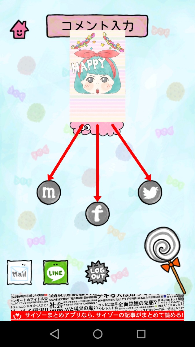 (6)完成した画像をシェアしたいときは、完成直後に表示されるSNSのアイコンからか、「Gallery」から画像を選んで「シェアする」をタップ。